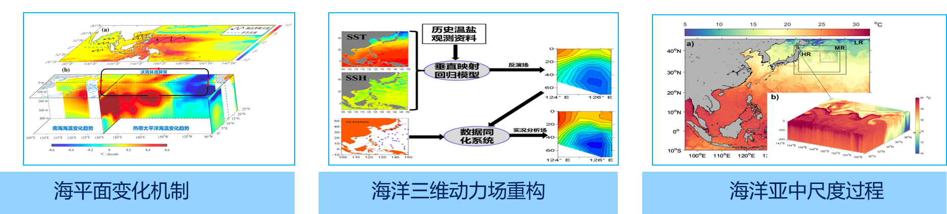 该方向瞄准国际前沿,结合国家战略、海洋经济需要,开展海洋及其相关的气象、水文等方面的研究工作,研究海洋动力现象和海洋探测技术等,研究内容涵盖海洋多尺度动力学、海气相互作用与气候变化、极地海洋与气象、海洋观测与数值模拟、数据同化与预测和海洋工程环境等。该方向设置三个研究所,发展团队建设模式,支撑学科平台发展。