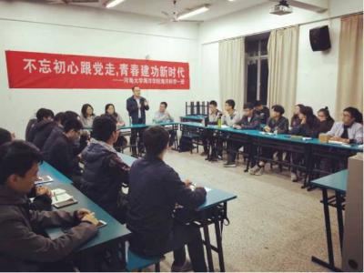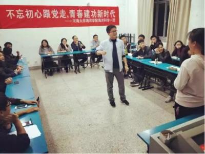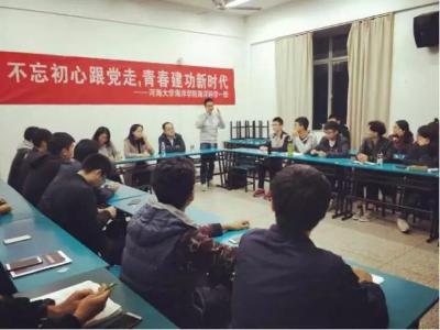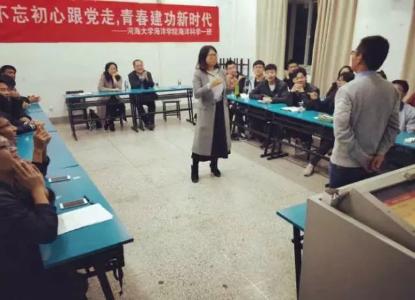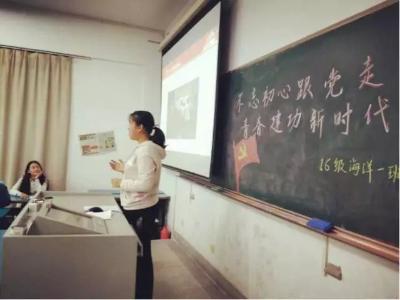 2017年11月16日,16级海洋科学一班在91短视频 江宁校区召开“不忘初心跟党走,青春建功新时代”主题班会。参会人员有后勤服务中心曹继平主任、91短视频 党总支王永芝书记、16级海洋科学一班班主任王涛老师、91短视频 团委书记安杰晶老师以及海洋科学一班全体同学。此次班会旨在对十九大精神进行宣传教育,团结引领大家听党话、跟党走。