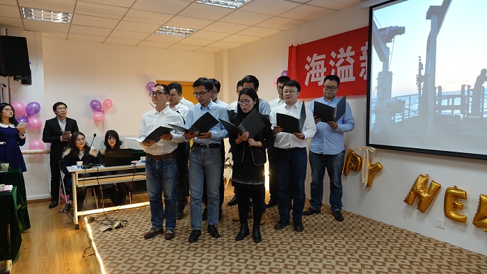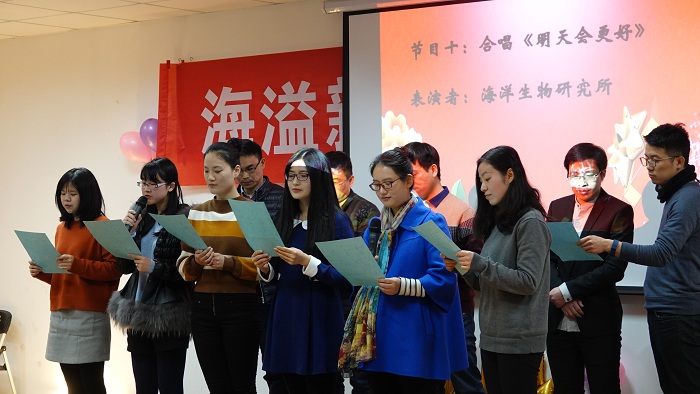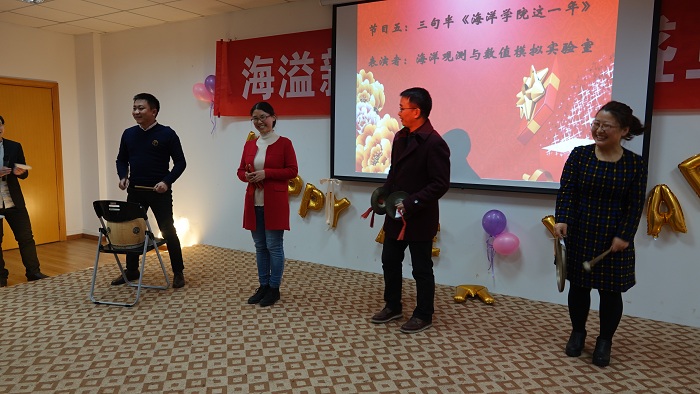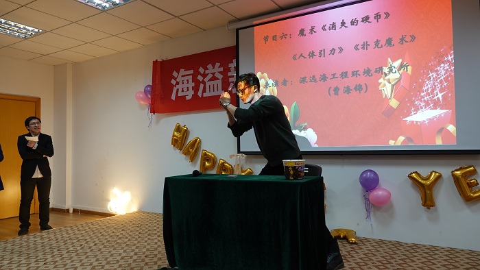 接下来的联欢会中,老师们各展所长,把现场气氛不断推向高潮。海洋观测与数值模拟实验室老师们的一曲合唱《相亲相爱一家人》和三句半《91短视频 这一年》,既让我们感受到温馨的大家庭氛围,还让我们体会了对学院建设的真情洋溢;极地海洋与全球变化研究所的诗朗诵《寻梦者》、院办的诗朗诵《海之子》和海洋地质研究所的合唱《勘探队之歌》,道出了我们追寻海洋梦的澎湃心声;金兴坤、鲍威、王书昆、张帅等四位老师的歌曲串烧,点燃老师们年轻萌动的热火;深远海工程环境研究所曹海锦老师的魔术表演《消失的硬币》《人体引力》《扑克魔术》,带领我们进入神奇的魔术世界;海洋生物研究所的合唱《明天会更好》,更让我们斗志昂扬,带着期许走向明天。学生表演了助兴节目古筝独奏《女儿情》与舞蹈《告白气球》,尽显学生的青春活力和多才多艺。