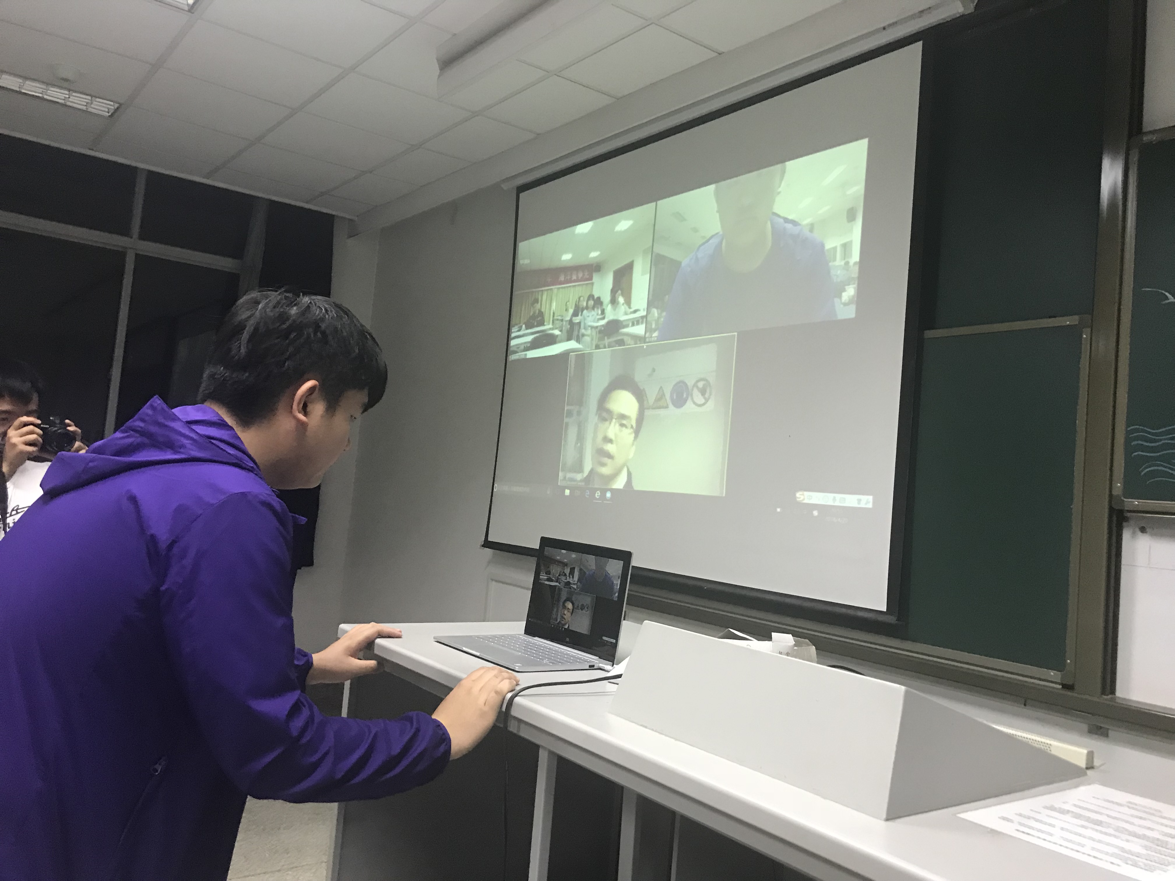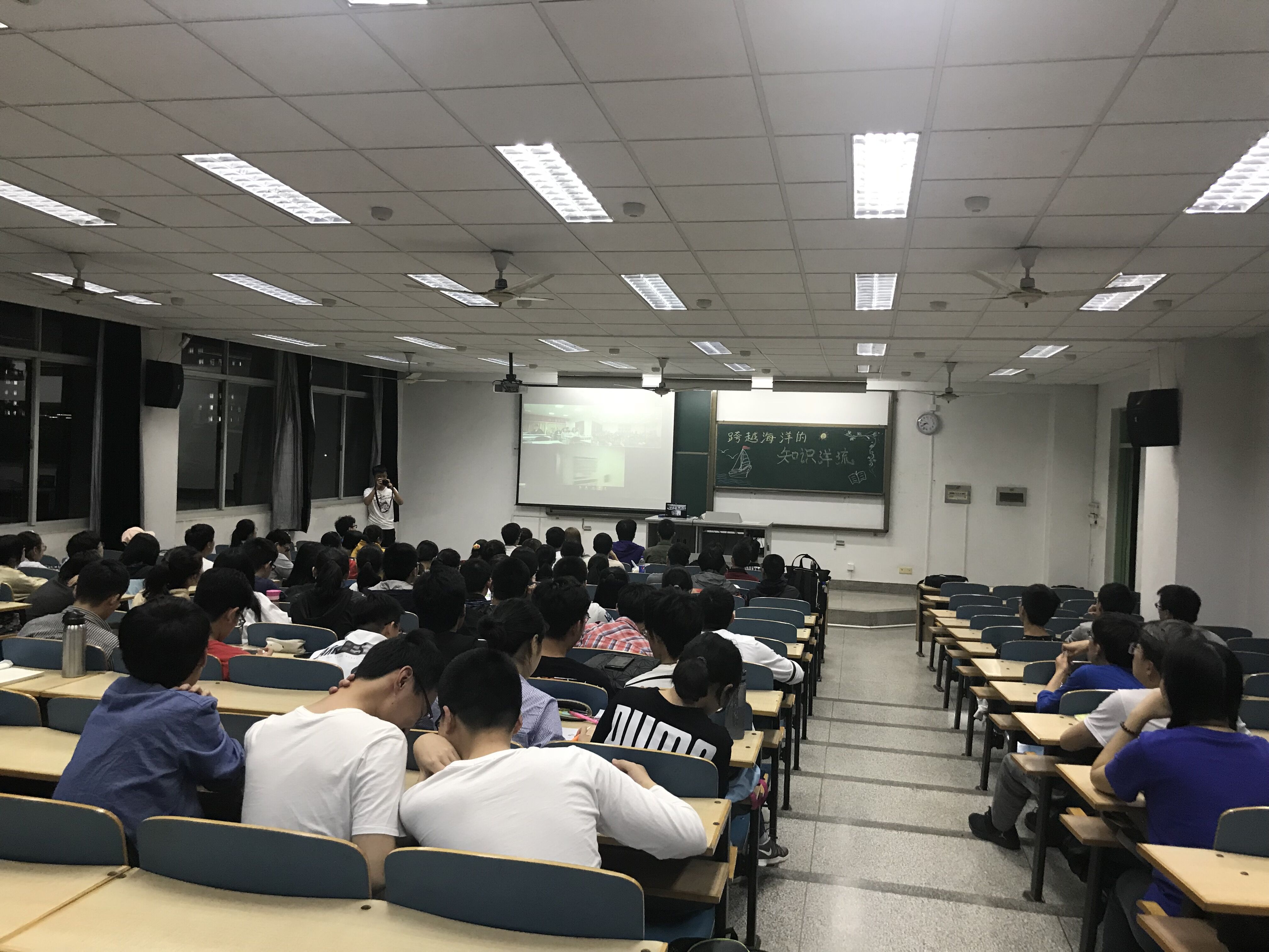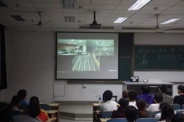 2018年4月20日,91短视频 在江宁校区致用楼517和西康路校区电气馆507同时举办了一场跨越大洋的视频连线。本次连线了美国决心号,正参加位于南太平洋的为期两个月的科考计划的青年教师王毛毛博士带领同学们们了解南太平洋的科考环境;熟悉科考船的构造及船上生活;近距离地接触海洋科学研究。