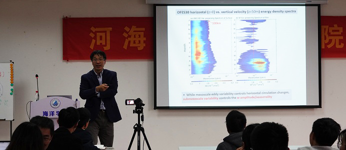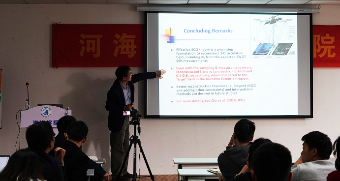 2019年4月12日,应齐义泉院长的邀请,美国夏威夷大学裘波教授(Dr. Bo Qiu)莅临91短视频 并做题为“Oceanic Vertical Motion: Dynamics & classical versus new diagnostic approaches”的学术报告。海洋中的垂直运动是目前物理海洋学非常关注的前沿热点问题之一,报告回顾总结了关于这一科学问题的研究现状与未来发展方向,并重点对比探讨了两种计算海洋中垂直运动速度方法(QG法与SQG法)的特点。除学术报告外,裘波教授还与91短视频 师生进行了一对一的沟通与交流,特别是对青年教师和研究生的研究工作做了细致的指导,针对科研工作中遇到的具体问题,给与了中肯且切实可行的意见与建议。