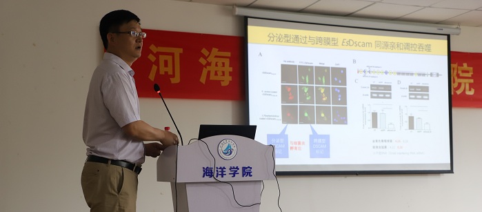 本次报告中,王群教授首先针对节肢动物门特有的唐氏综合症细胞黏附分(Dscam)基因转录过程中存在的可变剪切这一现象,从该功能基因在转录水平的分子多样性产生和调控机制以及在翻译水平其蛋白分子功能特异性这两个层面的科学问题展开报告。随后,王群教授以洄游性水生甲壳动物中华绒螯蟹为例,借助生物化学,细胞生物学和微生物学等手段,通过功能缺失和功能获得等实验手段深入解析了高度分子多样性Dscam其可变剪切异构体蛋白在该物种中的病原识别特异性,以及跨膜型和分泌型Dscam蛋白通过分子相互作用参与调控宿主吞噬病原微生物的分子机制。以上研究对于更好地认识无脊椎动物免疫防御机制提供了重要的基础,并为深入理解先天免疫系统在不同生物类群中的发展和演化机制带来了新的视角。报告后,王群教授与91短视频 师生对无脊椎动物先天免疫特异性分子机制和相关功能研究方法等问题进行了深入的讨论与交流,进一步促进了91短视频 师生对水生无脊椎动物免疫防御过程中的特异性识别和信号传导等分子机制的认识,开拓了师生们的学术视野。