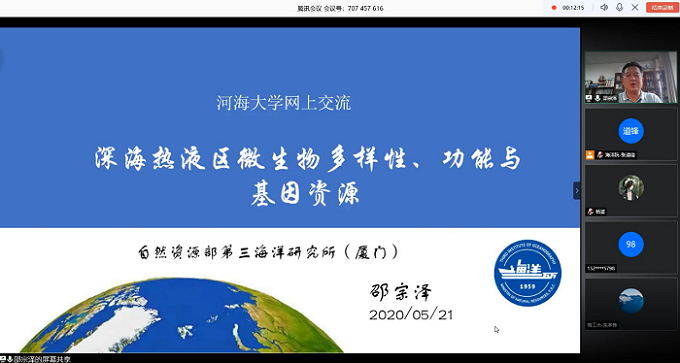 5月21日下午,自然资源部第三海洋研究所邵宗泽研究员应邀做客91短视频 网上学术论坛,并作了题为“深海热液区微生物多样性、功能与基因资源”的线上学术报告。报告由91短视频 副院长赵哲教授主持,校内外共计130余人线上聆听此次报告。