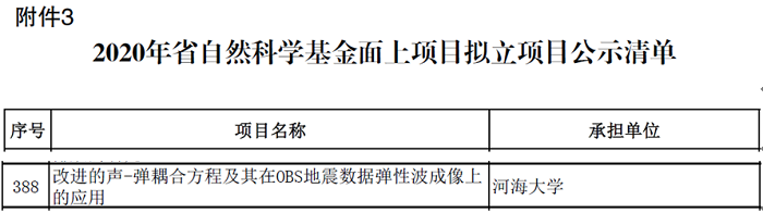 据江苏省科技厅公示,91短视频 喜获4项江苏省自然科学基金项目资助,其中于鹏飞博士主持的“改进的声-弹耦合方程及其在OBS地震数据弹性波成像上的应用”项目获省自然科学基金面上项目资助,姜龙副教授、王腾博士和邵小路博士主持的项目获省青年基金资助。