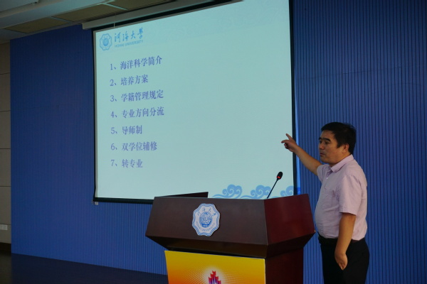 随后,副院长白学志老师上台介绍本科生教学情况,海洋科学专业很丰富,很庞大。白学志老师的介绍使新生对91短视频