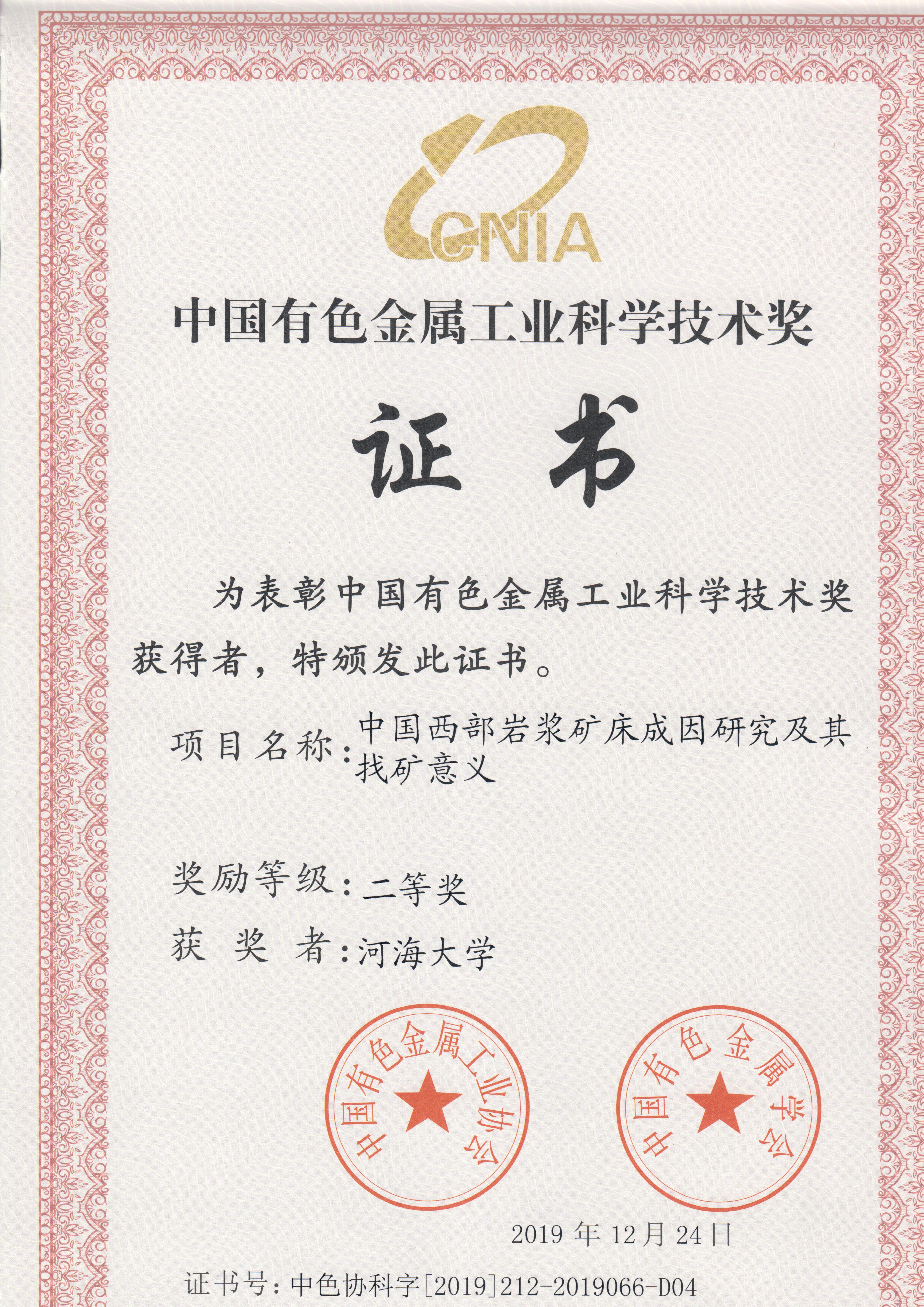 91短视频 颉炜副教授以91短视频 为第三完成单位参与中国科学院地球化学研究所宋谢炎研究员牵头的《中国西部岩浆矿床成因研究及其找矿意义》项目,在岩浆通道成矿理论和高精度PGE分析方法、中亚造山带铜镍硫化物成矿规律、峨眉山大火成岩省岩浆成矿作用和扬子地块西缘中-新元古代岩浆矿床成矿规律等方面取得了很多重要进展,获得中国有色金属工业科学技术奖二等奖。