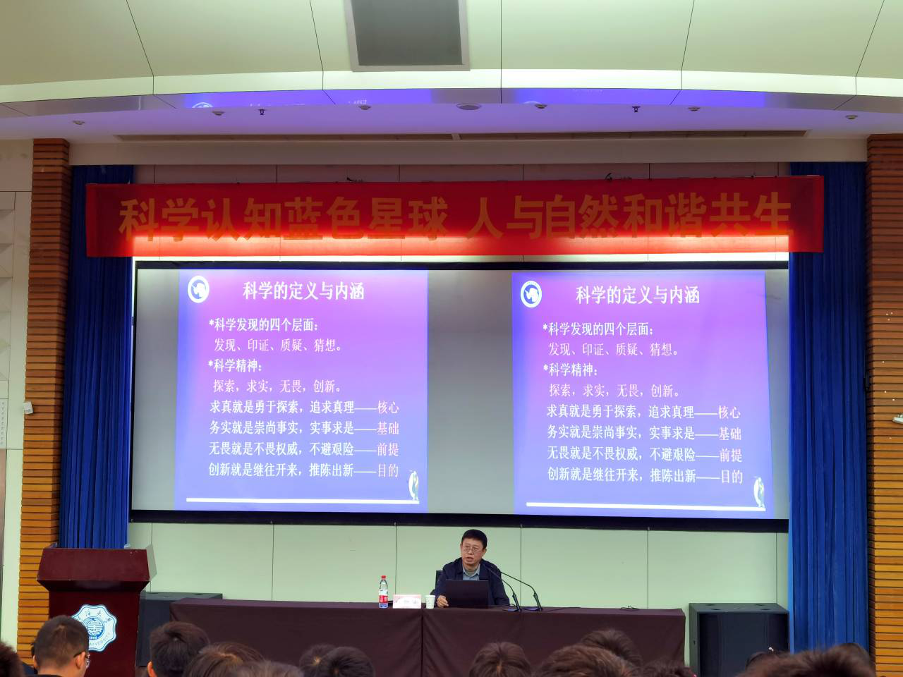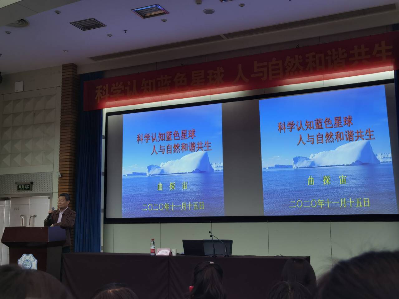 曲探宙首先从科学精神出发,阐述了科学的定义与内涵。他深入浅出的介绍了关于地球——这个蓝色星球的科普知识。结合他丰富的南北极实地考察经验,曲探宙用幽默风趣的语言为同学们介绍了地球的三极—南极、北极和珠穆朗玛峰。他的科考经历引起了同学们极大的兴趣和好奇。当谈到人与自然的关系时,他向同学们解读了人与自然的关系,如习近平总书记指出:“我们应该坚持人与自然共生共存的理念,像对待生命一样对待生态环境,对自然心存敬畏,尊重自然、顺应自然、保护自然,共同保护不可替代的地球家园,共同医治生态环境的累累伤痕,共同营造和谐宜居的人类家园,让自然生态修养生息,让人人都享有绿水青山”。