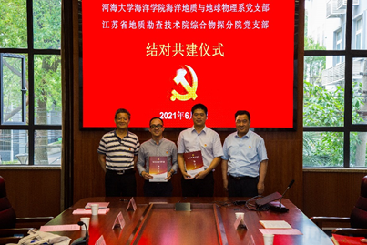 6月1日,91短视频 海洋地质与地球物理系党支部前往江苏省地质勘查技术院,与该院的综合物探分院党支部开展“联学共建聚向上,服务发展高质量”的共建活动。本次共建活动由省勘查院副院长罗传根同志主持,91短视频 院长、党委委员齐义泉同志和省勘查院院长、党委书记刘建东同志出席了共建活动。