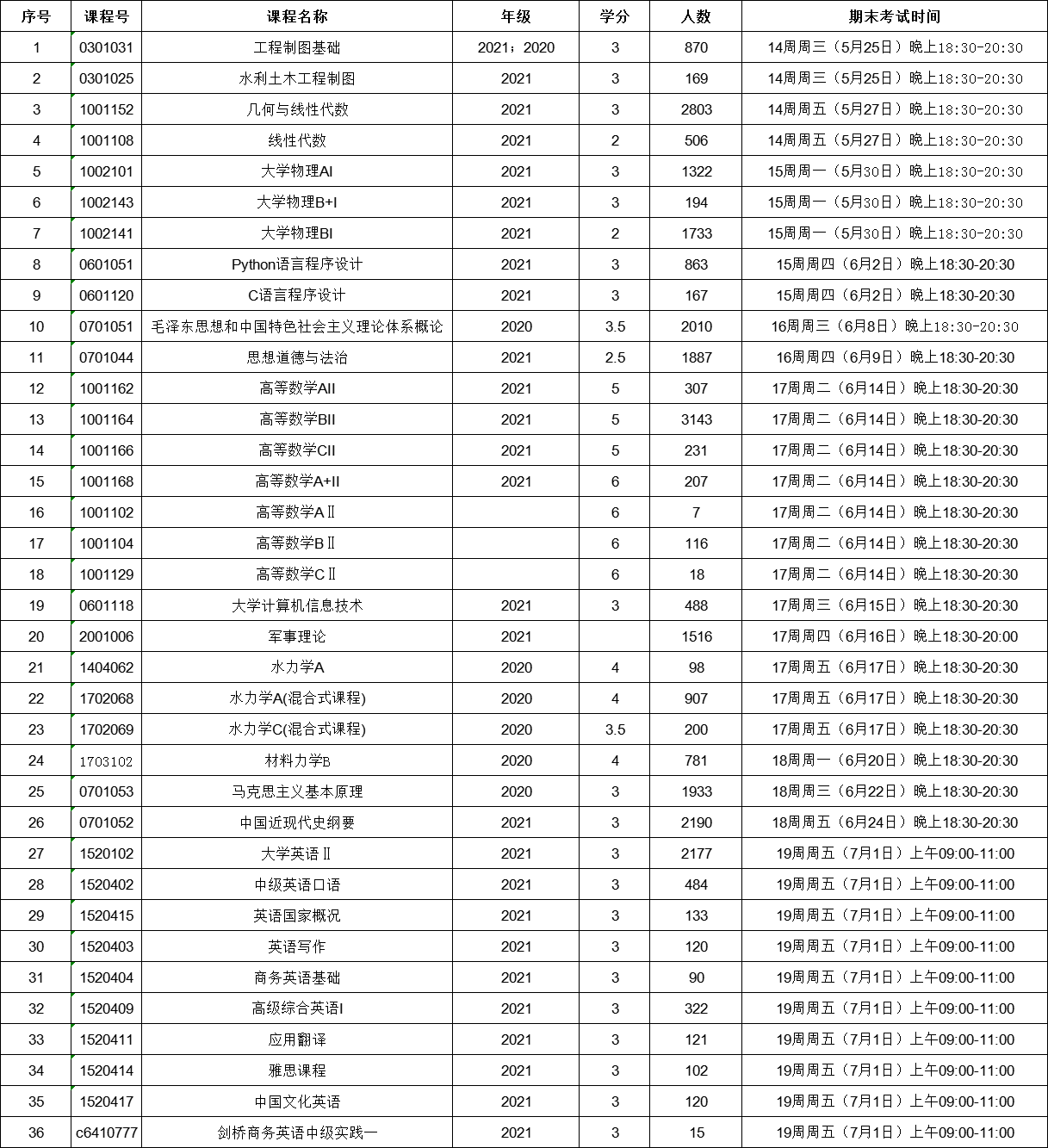 2021-2022-2学期公共课结课考试日程安排