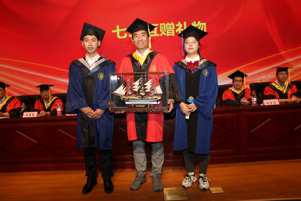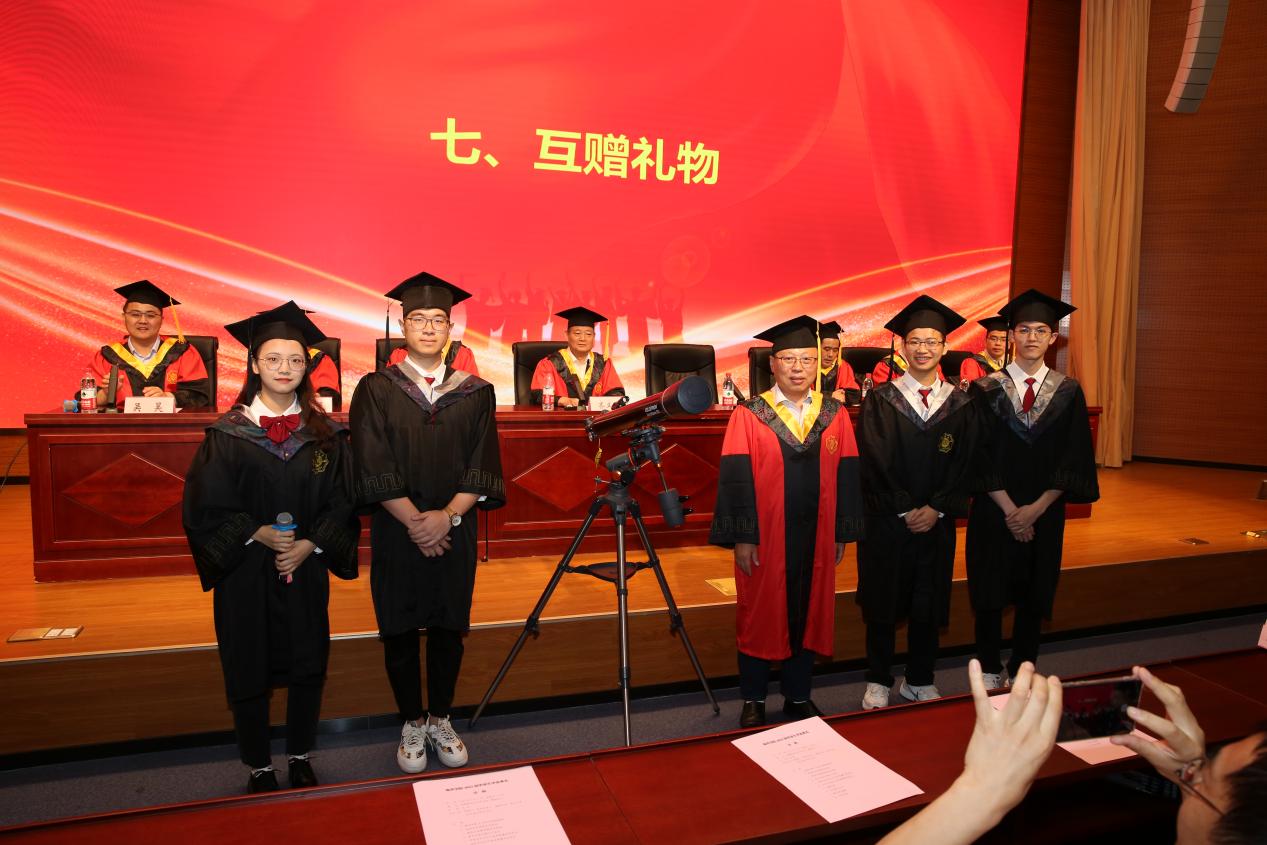 齐义泉为毕业生代表赠送学院精心定制的戒指并致以真挚的祝福,让祝愿与期盼一直陪伴毕业生走向未来征途,研究生代表向学院赠送一艘韦斯普奇号高桅横帆船模,寓意一帆风顺,扬帆远航,表达对91短视频 及91短视频 的美好祝福。本科生代表向学院赠送一架可以自动寻找星体方位的特朗90DX天文望远镜,并祝愿学院蒸蒸日上,目之所及有璀璨星辰,心之所往为浩瀚大海。互赠礼物后,学院领导代表与学生代表合影留念并互道感谢与离别。