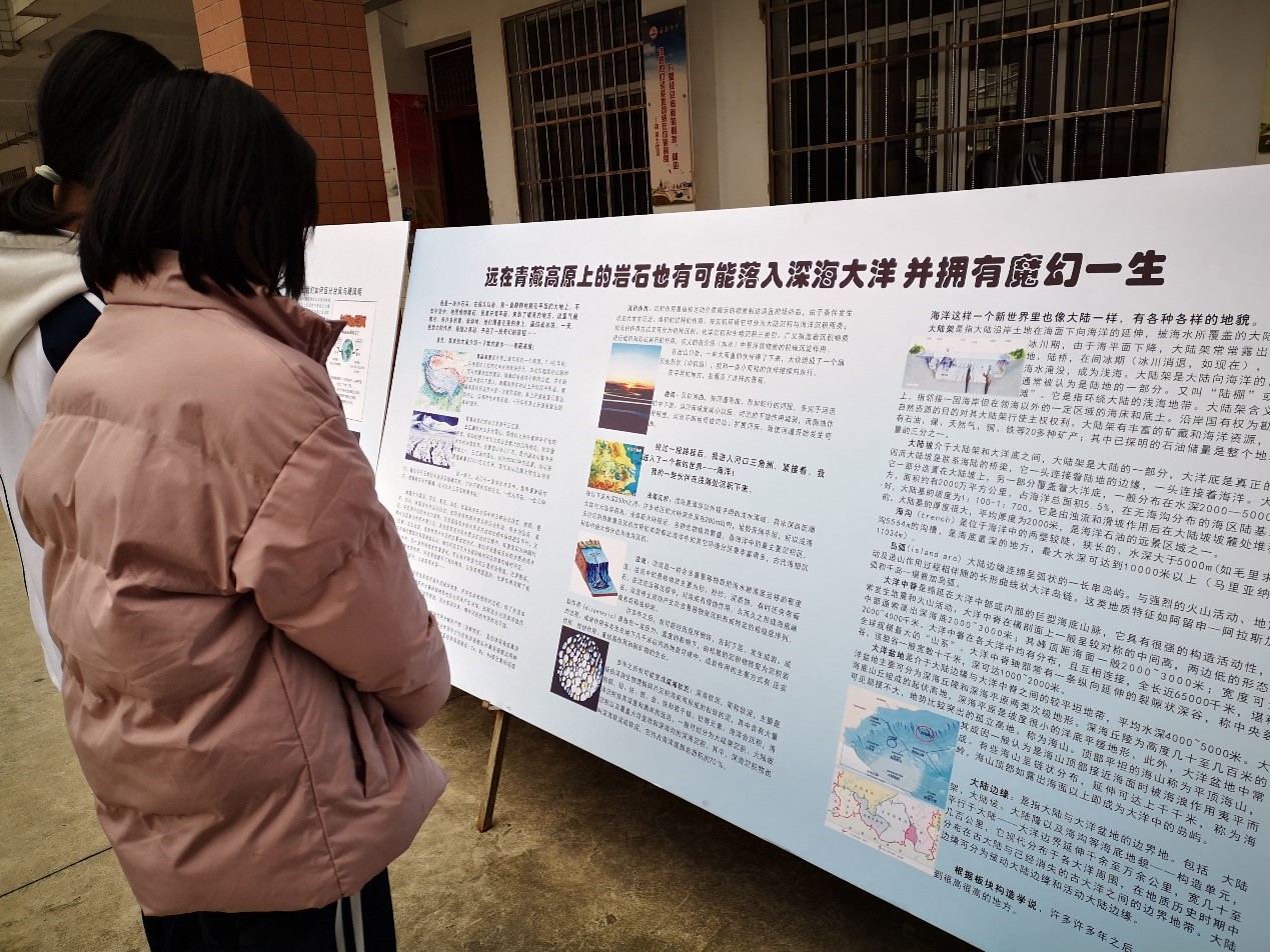 科普展共分为“迈进海洋”——岩石的地质经历展、 “跃动海洋”——海洋生物科普展、“走进蔚蓝”——海洋与气候、 “探索海洋”——海洋观测技术展4个展区,让海洋知识融入校园文化建设中,提高了学生们的科学素养,增强海洋意识,营造了良好的科普知识宣传氛围。