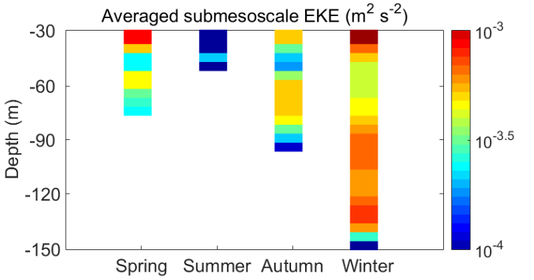图2. 基于观测资料的不同季节亚中尺度湍动能