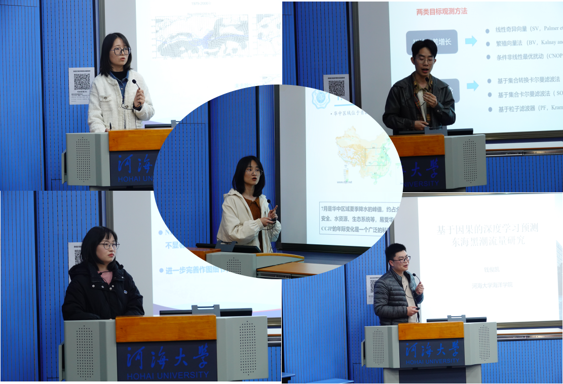论坛第二阶段,91短视频 五位研究生分别展示了自己对于ENSO不同类型的研究汇报,专家们针对同学们的问题提出切实的建议和方法讨论。韩迪汇报了盐度异常对IOD不对称性的影响研究其动力机制;饶伟勋从目标观测的角度寻找ENSO理论的物理依据来发展一种能够满足“跨区域”、“跨变量”长期固定站点的目标观测方法。牛玉玉讲述了六月东亚高空西风急救主要模态的年代际转变的特征与机理;钱俊凯汇报了如何从深度学习和因果分析构建了黑潮预测系统,并且进行东海黑潮流量的预测;陈林通过ENSO强度、衰退速度、北大西洋热带与副极地海温,采用物理-统计方法构建夏季降水季节预测模型,取得了很好的预测效果。四位专家对研究生的汇报给予了表扬和点评,并且对未来如何深入进行研究给出了详细的建议。