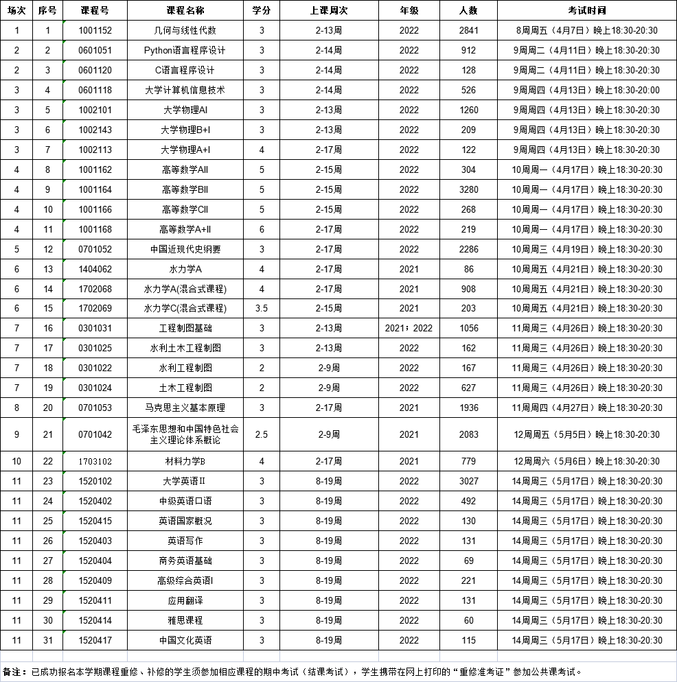 2022-2023--2学期公共课期中考试及部分课程结课考试日程安排