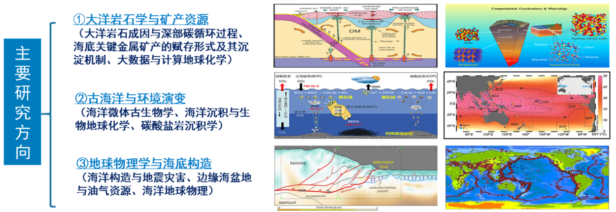 围绕国家战略需求,结合江苏省沿海地理优势,着重解决海洋资源与碳循环、古气候与古环境等关键科学问题;监测和预防海岸带地质灾害,服务江苏沿岸经济,开拓海洋地质大数据与机器学习新领域。主要研究方向包括大洋岩石学与海底资源、古海洋学与环境演变、地球物理学与海底构造,在国内外具有较高的影响力。