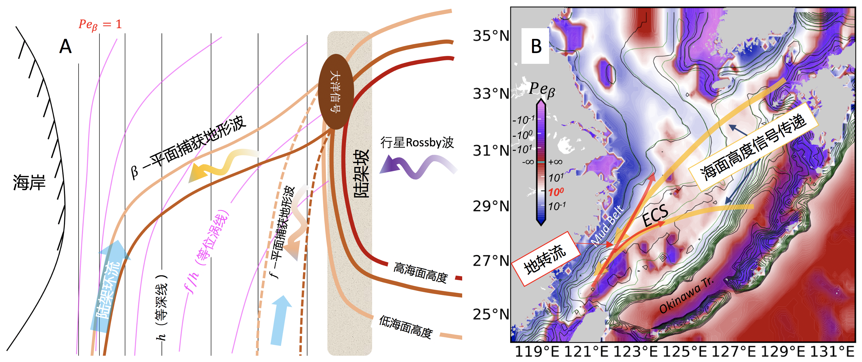 图1:“β-平面捕获地形波”驱动陆架环流的机制示意图(左),和在该机制作用下海面高度信号从对马海峡和黑潮主轴传播到东海陆架并驱动台湾暖流的示意图(右)。