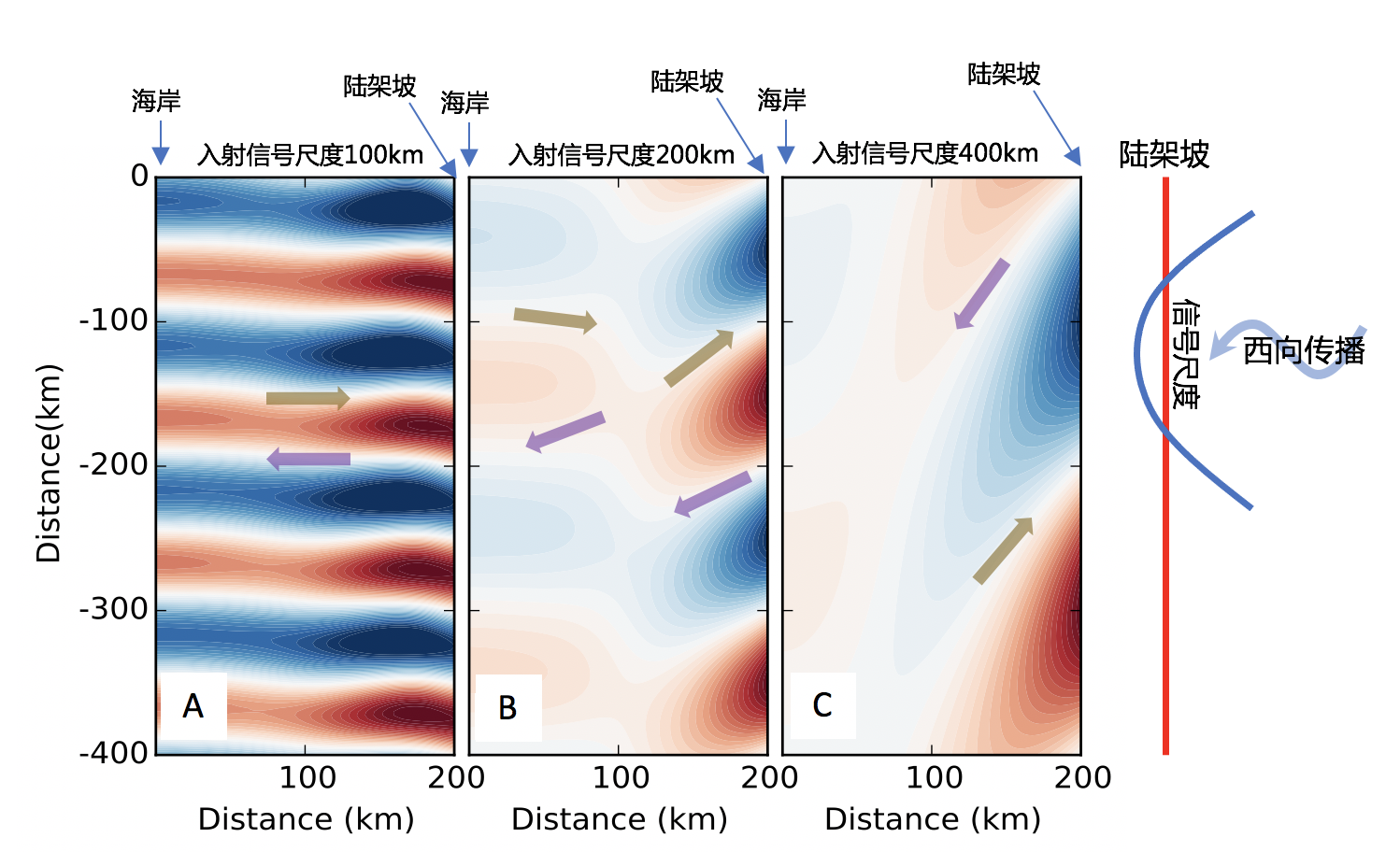 图2:根据“陆架外波动信号入射-反射”理论计算的大洋内区压强扰动信号在理想缓坡陆架上的传播特征,以及由此导致的跨陆架运动方向。