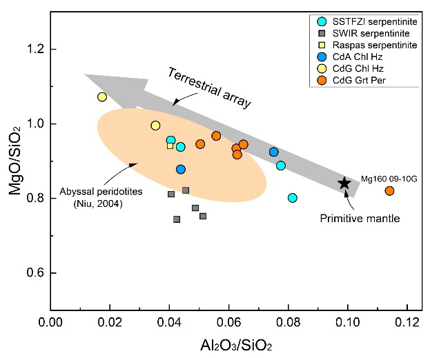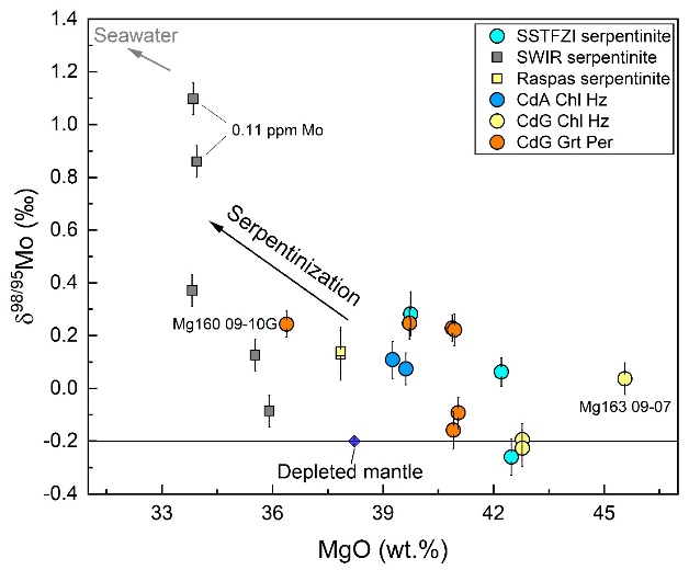 研究发现,SSTFZI大洋蛇纹岩具有高Mo含量(0.10-0.39 ppm),重Mo同位素组成(δ98/95Mo = -0.26‰到0.28‰)。结合近期文献中报道的西南印度洋脊蛇纹岩样品的Mo同位素数据(Mo含量:0.11-0.68 ppm, δ98/95Mo = -0.08‰到1.10‰),认为这些蛇纹岩的高Mo含量是其原岩受到高Mo熔体交代的结果。大洋蛇纹岩的Mo同位素组成与其MgO含量存在弱的负相关关系,暗示着大洋蛇纹岩的重Mo同位素组成是蛇纹岩化过程导致的,蛇纹岩化程度越高,蛇纹岩的Mo同位素越重(图3)。