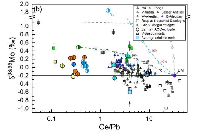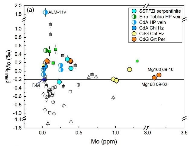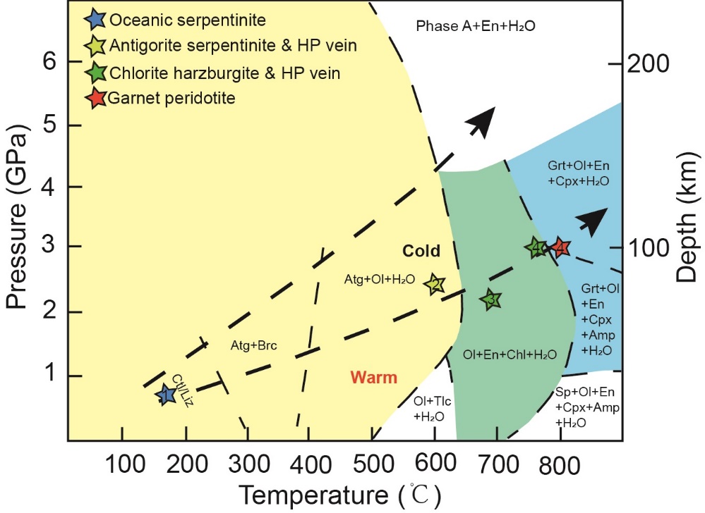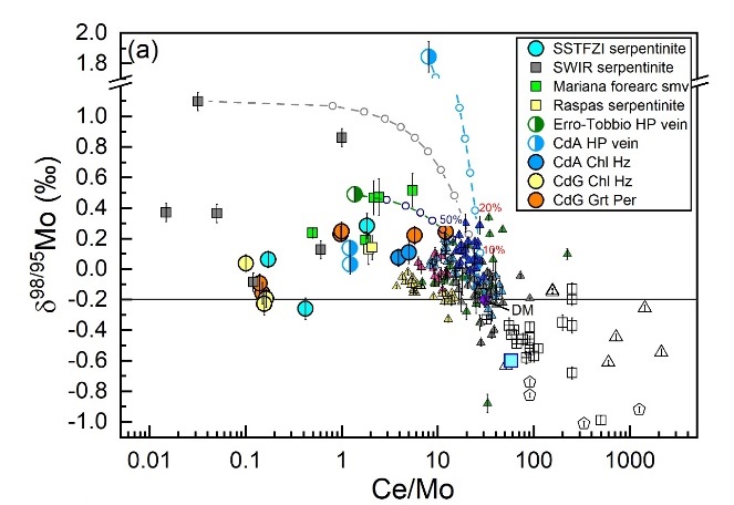岛弧是俯冲带元素迁移和物质循环的关键地带,其成因一直是俯冲带研究的前沿领域。人们普遍认为岛弧玄武岩是地幔楔水化熔融的产物,交代地幔楔的流体传统认为主要来自俯冲洋壳。然而俯冲洋壳在弧前深度已经脱去大部分水,所以洋壳不太可能是弧下深度流体的主要来源。因此,越来越多的研究认为俯冲蛇纹岩才是诱发岛弧岩浆作用的主要流体来源。尽管如此,准确示踪俯冲带蛇纹岩来源的流体仍面临着极大挑战,新兴的Mo同位素有望对此问题提供帮助。近年来蛇纹岩的Mo同位素有零星数据报道,但是人们对橄榄岩蛇纹岩化和蛇纹岩进变质脱水过程中Mo同位素分馏行为还未知,这就限制了利用Mo同位素来精确示踪岛弧岩浆地幔源区中俯冲蛇纹岩的贡献。
