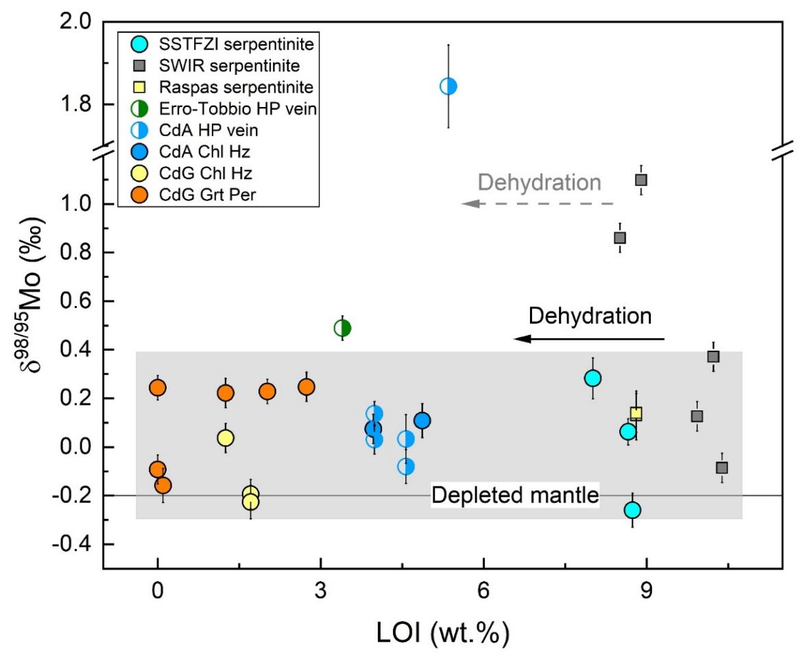 图4 本次研究涉及样品的烧失量(LOI)与Mo同位素协变图解。阴影区域涵盖了原岩蛇纹岩化程度相似的样品。