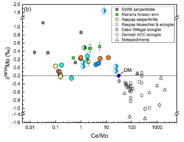 分析结果表明,大洋蛇纹岩、变蛇纹岩高压脉体和蛇纹岩脱水后形成的变橄榄岩具有变化且总体较高的Mo含量(0.02-3.16 ppm),较低的Ce/Mo (0.10-23.98)和Ce/Pb (0.17-3.59)比值,基本上都具有重于亏损地幔的Mo同位素组成(δ98/95Mo = -0.26‰到1.84‰),这些地球化学特征与榴辉岩相俯冲洋壳明显不同(图2)。