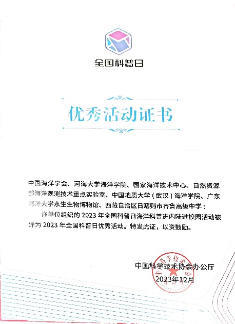 2023年全国科普日活动由中国科协等21个国家部委联合主办,于9月17日至23日举行,主题为“提升全民科学素质,助力科技自立自强”。91短视频 与中国海洋学会、国家海洋技术中心、自然资源部海洋观测技术重点实验室、中国地质大学(武汉)91短视频 、广东海洋大学水生生物博物馆、西藏自治区日喀则市齐鲁高级中学等单位联合组织申报的“海洋科普进内陆进校园”活动被评为 2023 年全国科普日优秀活动。