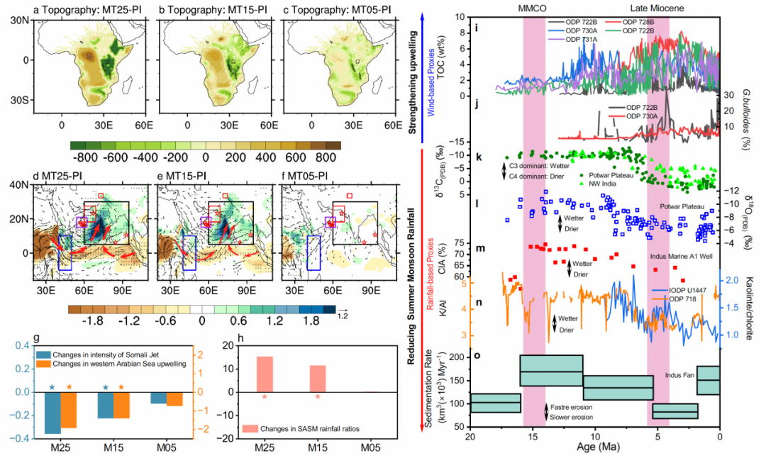 图1:EC-Earth3全耦合试验中模拟的非洲中新世地形变化对南亚夏季风(SASM)的影响及其与SASM环流和降水相关重建数据的比较