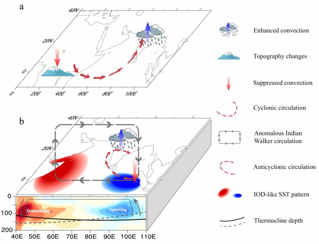 图2:中新世非洲地形变化对南亚夏季风环流和降水的影响机制示意图