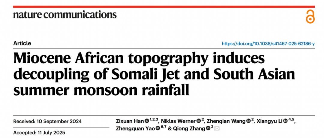 论文信息:Han, Z., Werner, N., Wang, Z. et al. Miocene African topography induces decoupling of Somali Jet and South Asian summer monsoon rainfall. Nat Commun 16, 7172 (2025).